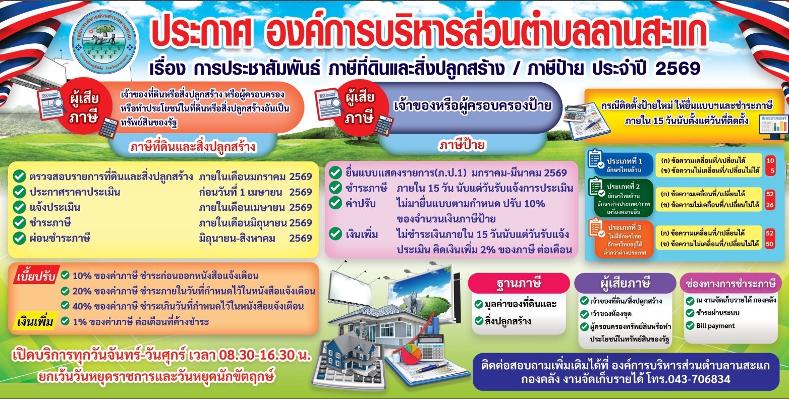 - ประกาศ เรื่อง การขยายกำหนดเวลาดำเนินการตามพระราชบัญญัติภาษีที่ดินและสิ่งปลูกสร้าง พ.ศ.2562 ประจำปี พ.ศ.2569